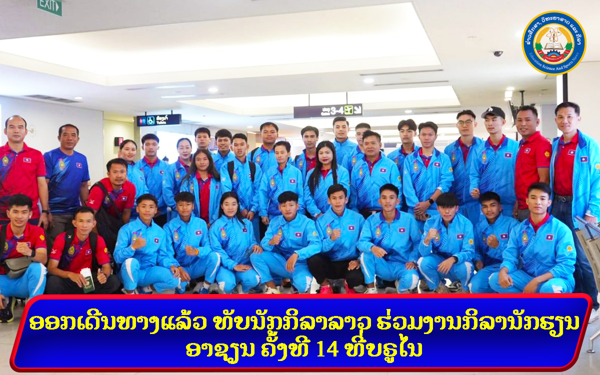 ໃນຕອນເຊົ້າວັນທີ 18 ພະຈິກ 2025 ທີ່ສະໜາມບິນສາກົນວັດໄຕ ນະຄອນຫຼວງວຽງຈັນ, ຄະນະນຳ, ຄູຝຶກ ແລະ ນັກກິລາ ນັກຮຽນລາວ ຈຳນວນ 37 ທ່ານ ນຳໂດຍ ທ່ານ ຫຼອດສະຖິດ ສຸກຂະຜົນ ຮອງຫົວໜ້າກົມກິລາມວນຊົນ, ພະລະ ແລະ ສິລະປະສຶກສາ ກະຊວງສຶກສາທິການ ແລະ ກິລາ ໄດ້ອອກເດີນທາງເປັນທີ່ຮຽບຮ້ອຍ ເພື່ອເຂົ້າຮ່ວມແຂ່ງຂັນງານກິລານັກຮຽນອາຊຽນ ຄັ້ງທີ 14 ລະຫວ່າງວັນທີ 20-28 ພະຈິກ 2025 ທີ່ປະເທດບຣູໄນ ດາລູຊາລາມ. ແນວໃດກໍຕາມ ຍັງມີຄະນະນຳ ອີກຈຳນວນໜຶ່ງ ແມ່ນຈະອອກເດີນທາງໃນມື້ອື່ນ (19 ພະຈິກ 2025) ເພື່ອເຂົ້າຮ່ວມພິທີເປີດໃນຕອນແລງວັນທີ 20 ພະຈິກ 2025