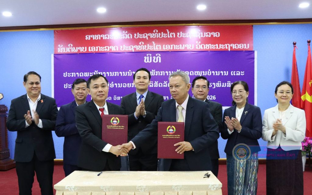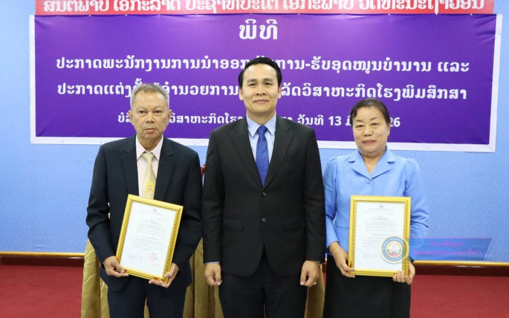 ໂອກາດດັ່ງກ່າວ, ທ່ານ ອຸບັນ ສຸພິດາ ຫົວໜ້າກົມຈັດຕັ້ງ ກະຊວງການເງິນ ໄດ້ຂຶ້ນຜ່ານຂໍ້ຕົກລົງ ຂອງກະຊວງການເງິນ ສະບັບເລກທີ 0796/ກງ, ເລກທີ 0797/ກງ ລົງວັນທີ 27 ກຸມພາ 2026 ວ່າດ້ວຍການອະນຸມັດໃຫ້ຜູ້ອຳນວຍການ ແລະ ຮອງຜູ້ອຳນວຍການບໍລິສັດລັດວິສາຫະກິດໂຮງພິມສຶກສາ ອອກພັກການຮັບອຸດໜູນບຳນານ ແລະ ຂໍ້ຕົກລົງຂອງກະຊວງການເງິນ ສະບັບເລກທີ 0795/ກງ ວ່າດ້ວຍການແຕ່ງຕັ້ງຜູ້ອຳນວຍການບໍລິສັດລັດວິສາຫະກິດໂຮງພິມສຶກສາ ໂດຍອີງຕາມກົດໝາຍວ່າດ້ວຍລັດວິສາຫະກິດສັບເລກທີ 33/ສພຊ, ລົງວັນທີ 29 ທັນວາ 2022, ອີງຕາມ ດຳລັດວ່າດ້ວຍວິສາຫະກິດລັດລົງທຶນ, ສະບັບເລກທີ 322/ລບ, ລົງວັນທີ 2 ກັນຍາ 2022, ອີງຕາມ ດຳລັດການຈັດຕັ້ງ ແລະ ເຄື່ອນໄຫວຂອງກະຊວງການເງິນ, ສະບັບເລກທີ 538/ນຍ ລົງວັນທີ 21 ສິງຫາ 2025, ອີງຕາມ ໜັງສືສະເໜີຂອງກະຊວງສຶກສາທິການ ແລະ ກິລາ ສະບັບເລກທີ 1569/ສສກ, ລົງວັນທີ 15 ສິງຫາ 2025 ແລະ ອີງຕາມແຈ້ງການຂອງຄະນະປະຕິຮູບລັດວິສາຫະກິດ, ເລກທີ 014/ຄປລກ-03, ລົງວັນທີ 09 ກຸມພາ 2026 ລັດຖະມົນຕີກະຊວງການເງິນ ຕົກລົງອະນຸມັດໃຫ້ ທ່ານ ຄຳບອນ ບຸນນະລາດ ອາຍຸ 69 ປີ ຜູ້ອຳນວຍການບໍລິສັດລັດວິສາຫະກິດໂຮງພິມສຶກສາ ແລະ ທ່ານ ນາງ ນ້ອຍ ສຸວັນວິໄຊ ອາຍຸ 63 ປີ ຮອງຜູ້ອຳນວຍການບໍລິສັດລັດວິສາຫະກິດໂຮງພິມສຶກສາ ອອກພັກການຮັບອຸດໜູນບຳນານ, ໃນງວດ I/2026 ເລີ່ມວັນທີ 01 ມີນາ 2026 ໂດຍມອບໃຫ້ ບໍລິສັດລັດວິສາຫະກິດໂຮງພິມສຶກສາ ປະຕິບັດນະໂຍບາຍໃຫ້ຜູ້ກ່ຽວຕາມກົດໜາຍ ແລະ ລະບຽບທີ່ກ່ຽວຂ້ອງຂອງບໍລິສັດ, ທ່ານທີ່ຖືກແຕ່ງຕັ້ງ ແລະ ພາກສ່ວນທີ່ກ່ຽວຂ້ອງຈົ່ງຮັບຮູ້ ແລະ ພ້ອມກັນຈັດຕັ້ງປະຕິບັດຂໍ້ຕົກລົງສະບັບນີ້ຢ່າງເຂັ້ມງວດ.