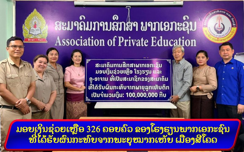 - ມອບເງິນຊ່ວຍເຫຼືອ 326 ຄອບຄົວ ຂອງໂຮງຮຽນພາກເອກະຊົນ ທີ່ໄດ້ຮັບຜົນກະທົບຈາກພະຍຸໝາກເຫັບ ເມືອງສີໂຄດຕະບອງ